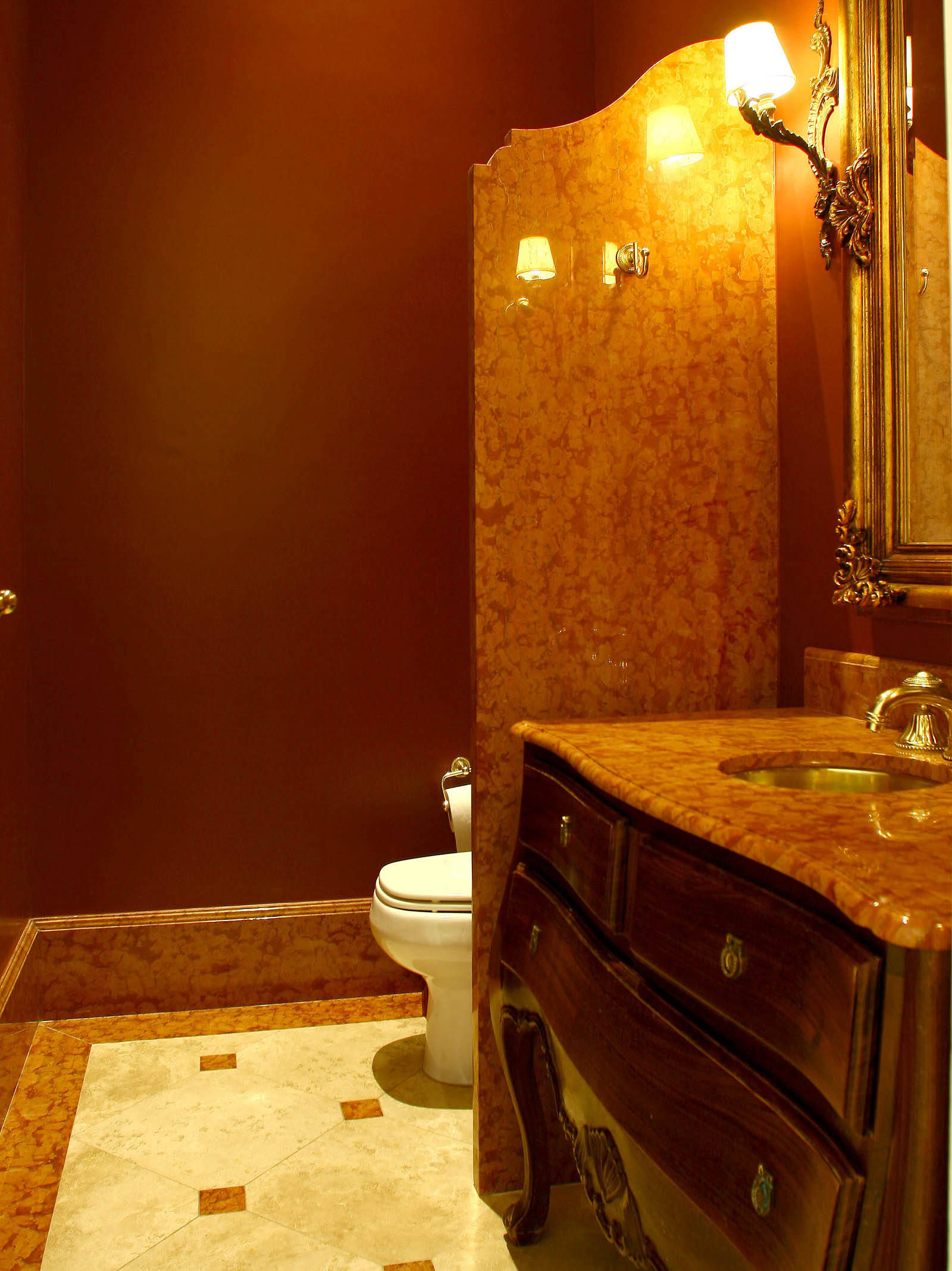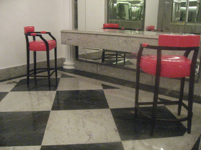 Piso em Travertino Romano Estucado e Levigado com cabouchon em mármore Rosso Verona