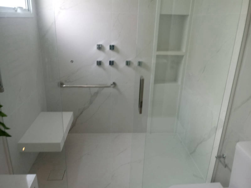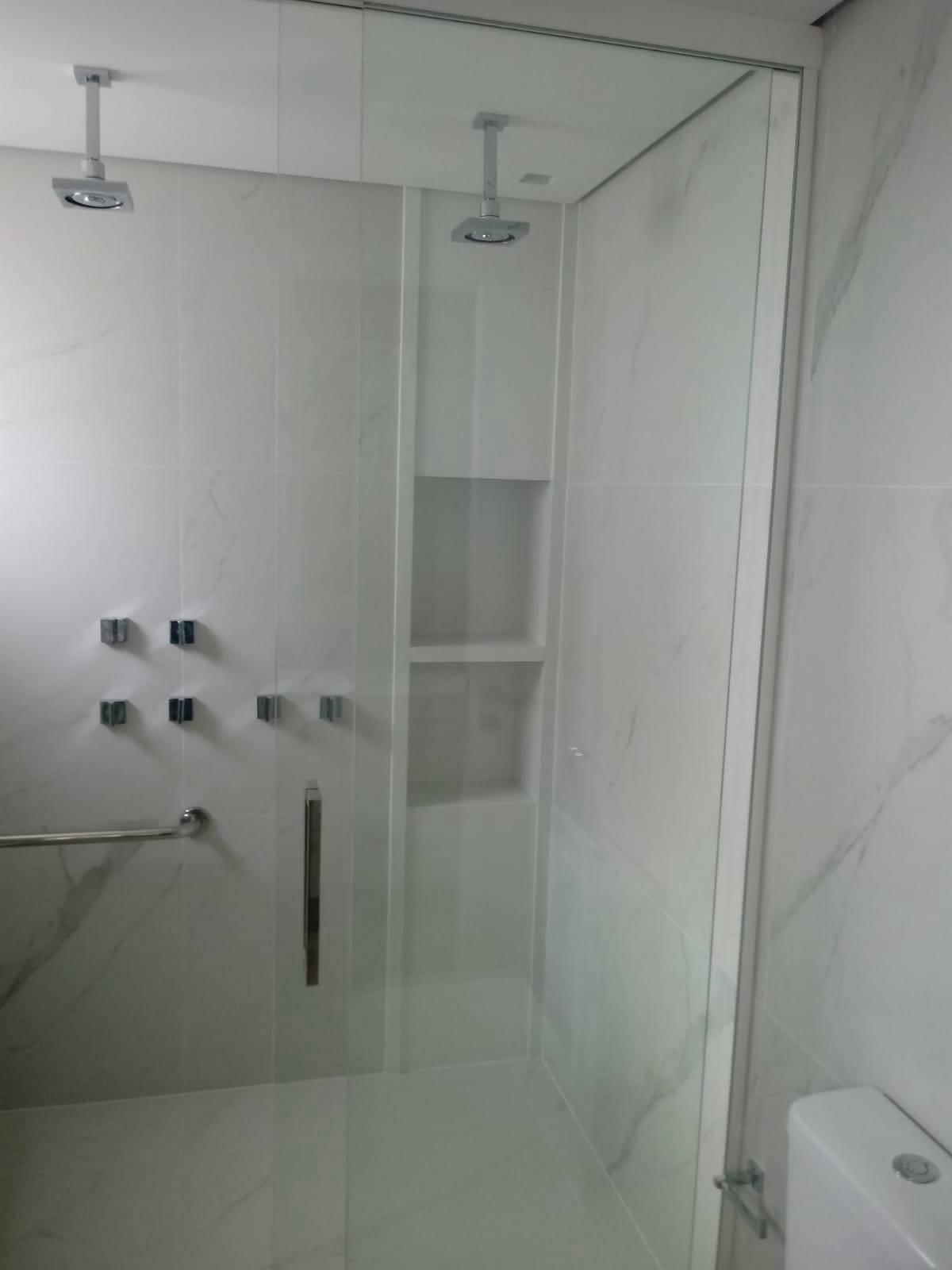 Detalhe de nicho e banco de box em Mármore Pigues Polido