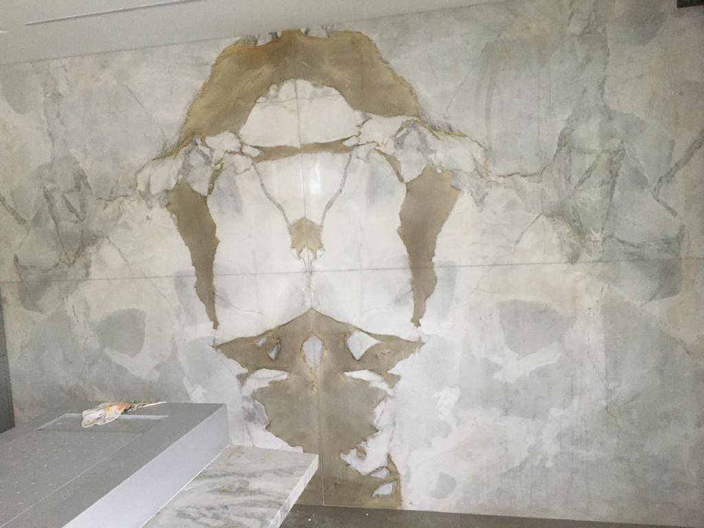 Detalhe de parede com paginação “ livro aberto” em mármore Statuário Venato Polido