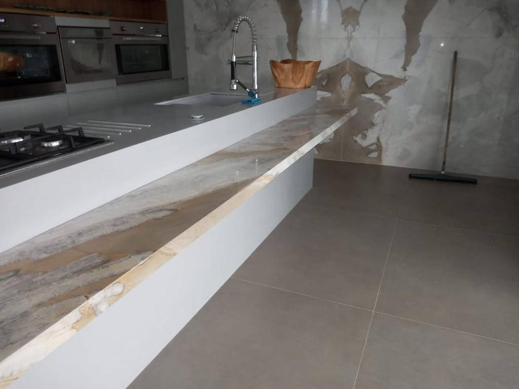 Bancada em Mármore Calacataa oro Polido com detalhe em Onix
